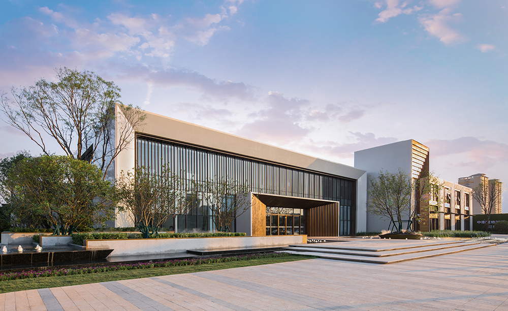 售楼部建筑将整个场地分为两个部分:前场—浅屿芳庭和后场—浮花月影。设计利用开敞空间的展示性特性,以完全开敞式来打造,通过景观与建筑的有机融合互相渗透打造整体性更强的景观空间。
