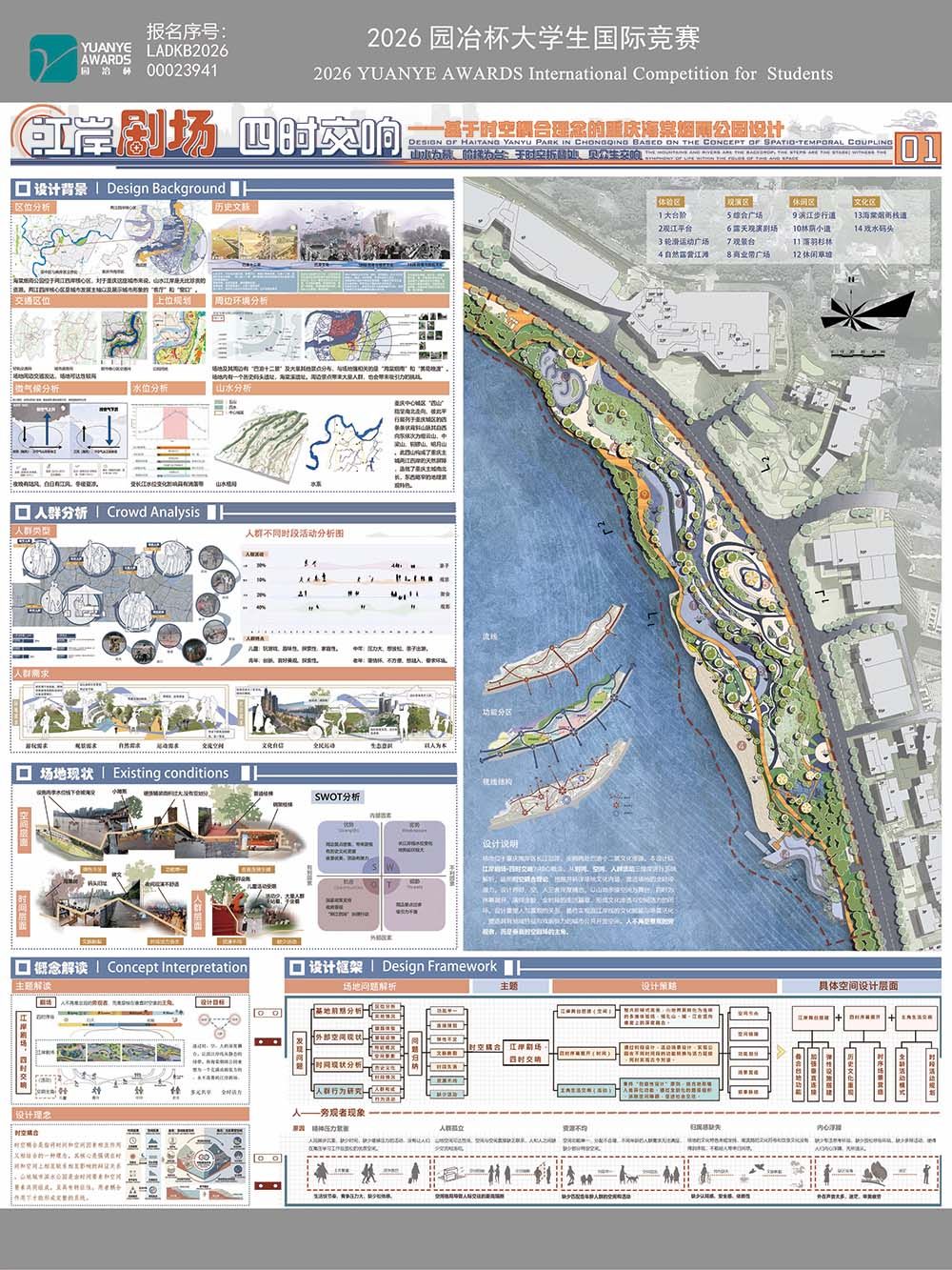 本设计场地位于重庆南岸区长江沿岸,坐拥两处巴渝十二景文化资源。设计以江岸剧场·四时交响为核心概念,从时间、空间、人群活动三维度进行系统解析,运用时空耦合理论,挖掘并转译场地文化内涵,激活场地的全时段潜 ...