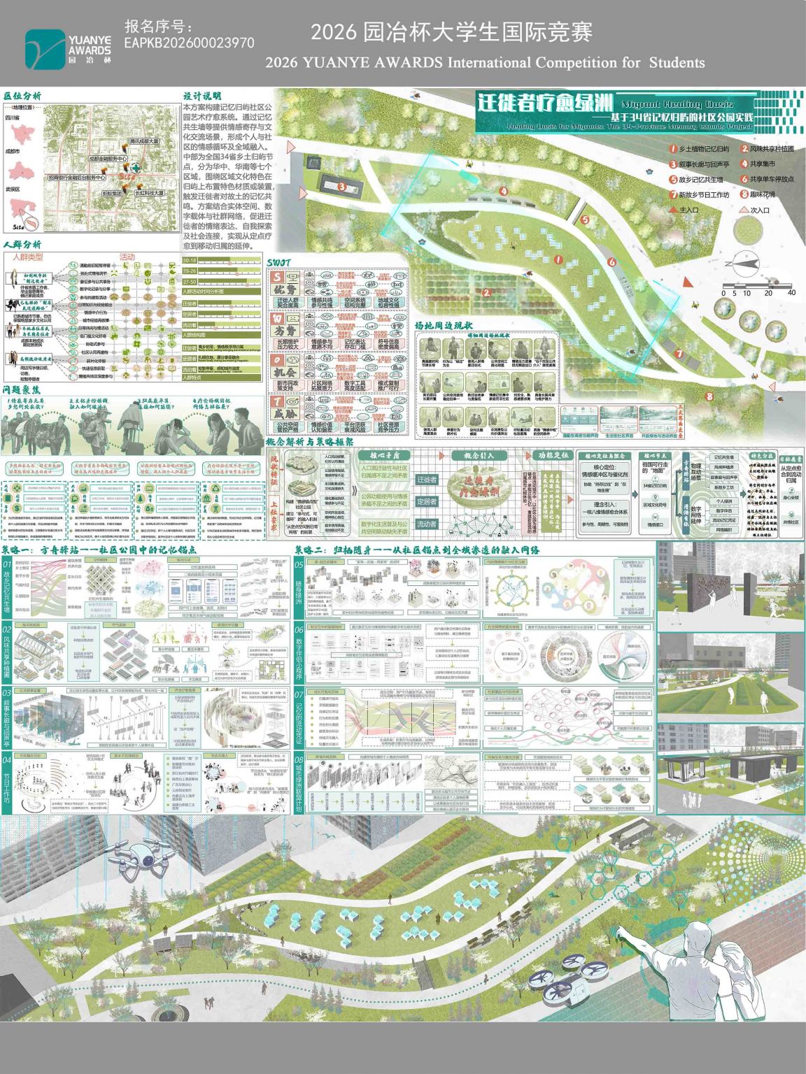 本方案构建记忆归屿社区公园艺术疗愈系统。通过记忆共生墙等提供情感寄存与文化交流场景,形成个人与社区的情感循环及全域融入。中部为全国34省乡土归屿节点,分为华中、华南等七个区域,围绕区域文化特色在归屿上布 ...