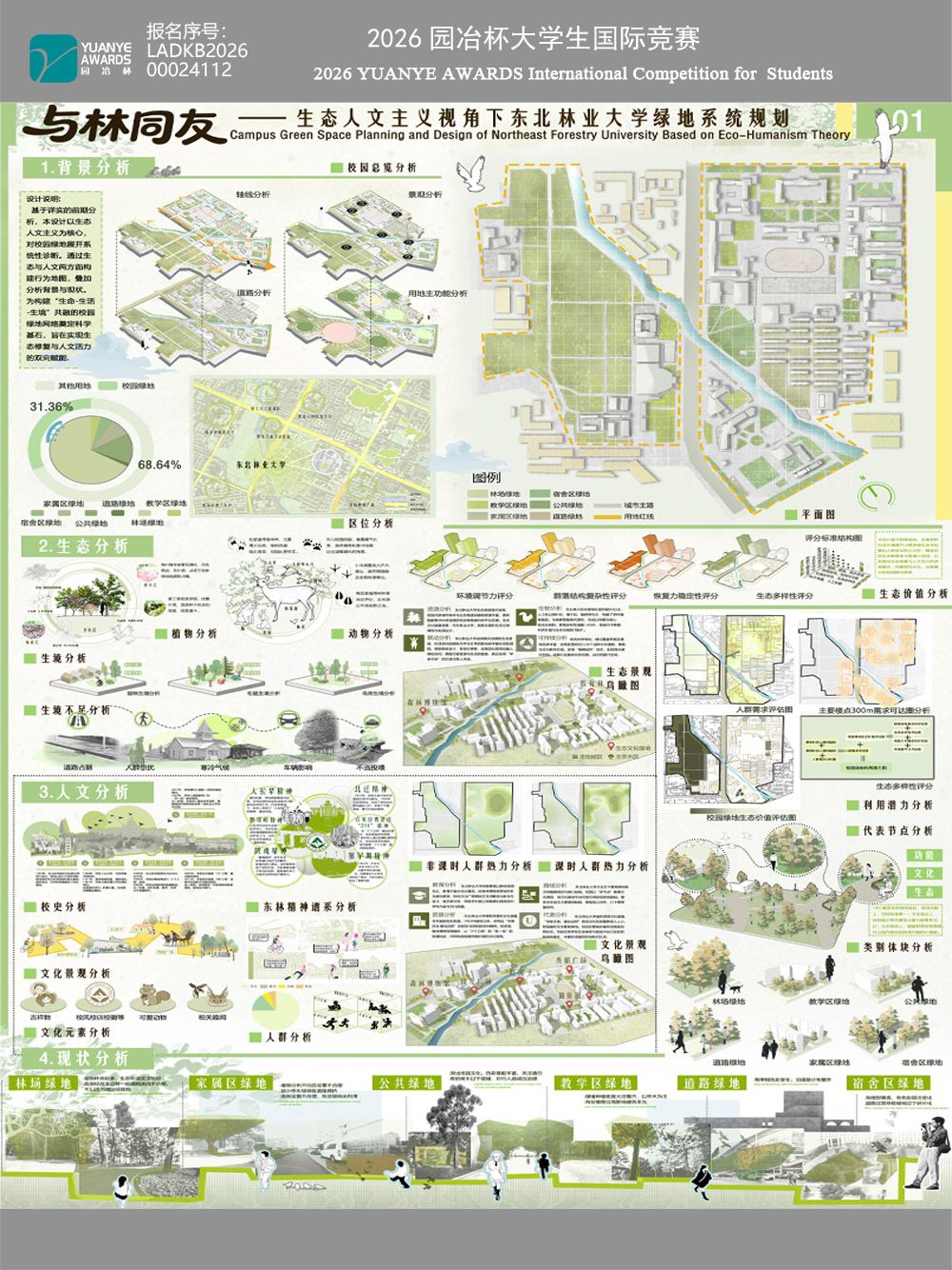 本设计以生态人文主义为核心,对东北林业大学校园绿地做系统性诊断,结合生态与人文构建行为地图、叠加分析现状,为打造 “生命 - 生活 - 生境” 共融的绿地网络奠基,实现生态修复与人文活力双向赋能。设计从生态、 ...