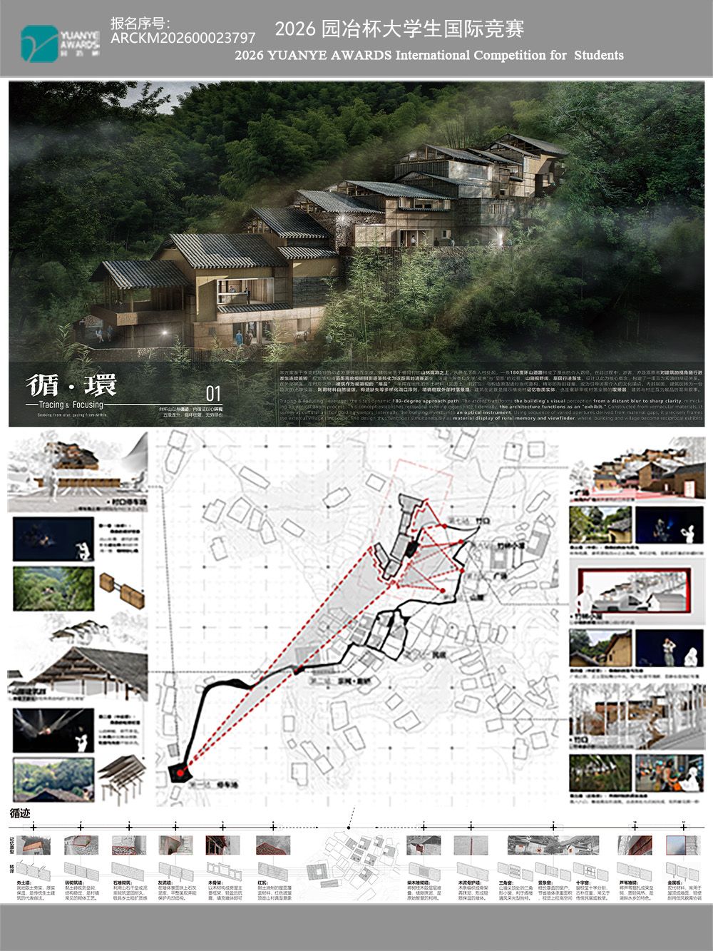 本方案基于横岗村独特的动态地景体验而生成。建筑坐落于横冈村的山林高地之上,从停车下车入村处起,一条180度环山道路构成了漫长的介入路径。在此过程中,游客,亦是观察者对建筑的视角随行进发生连续偏转,视觉感 ...