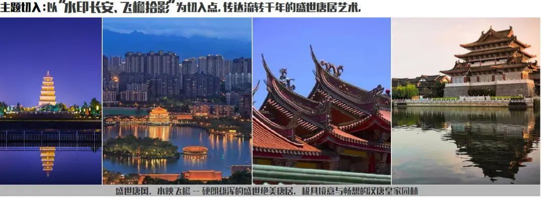 设计师以“水印长安、飞檐拾影”为切入点,萃取雄浑汉唐建筑之风与极具境意与畅想的汉唐园林思想,传达与演绎出流转千年的盛世唐居艺术。