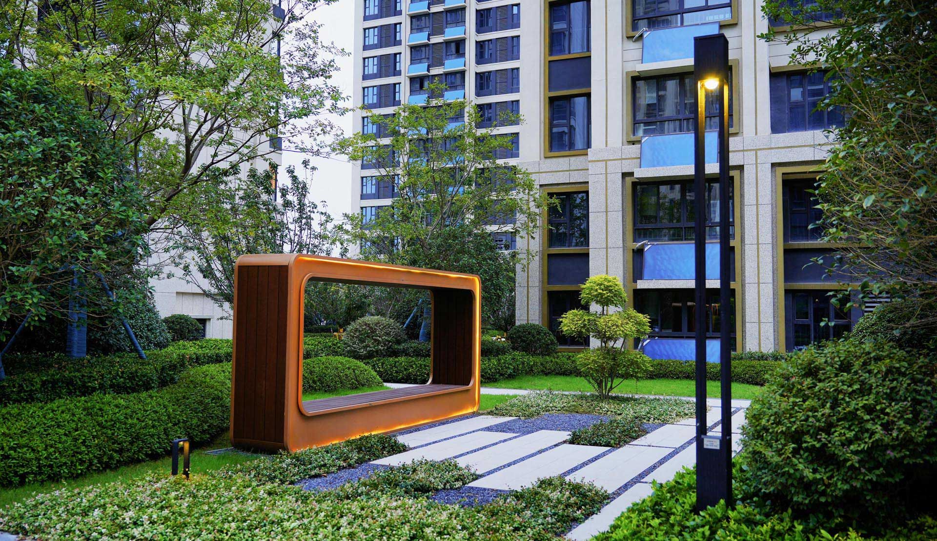 项目概述:华地学赋名苑景观、雨污水工程,包括绿地绿化、基础工程、硬质铺装地坪、景观小品、车行道、消防通道铺贴、园内配套设施、给排水、照明、雨污水、土方回填等。 设计理念与思想: 突出时尚现代简约的整体景观设计风格,以青年人为产品主要客群定位,融入科技感和现代智能景观空间,同时注重老年人和儿童的的空间打造,打造现代,科技,健康智慧住宅新标杆。 设计亮点、特点: 大绿量,高密度的景观设计,将景观与生态环境联 系在一起,使居住者更乐于参与其中,赋予场地生 态活力的特性,打造“幻境森林”般的居住环境。 施工重难点:门楼铝板排版及与地面铺贴对缝;工期紧交叉施工,铺装及地被成品保护;冬季及高温天气施工苗木成活率措施;冬季寒冷天气混凝土浇筑及铺贴防冻保护;化粪池、雨水收集系统基坑防护